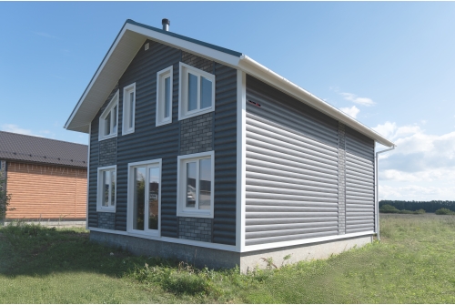 - В отличие от облицовки фасада деревом, сайдинг под бревно металлический «Блок-хаус» прост в монтаже и не требует дополнительного послемонтажного ухода.