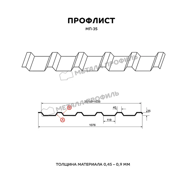 Профлист МЕТАЛЛ ПРОФИЛЬ МП-35x1035-B (ОЦ-01-БЦ-0,6) часто используется для оформления профилированного листа. Представляет собой металлический оцинкованный лист с покрытием. Общая толщина стальной основы с оцинковкой и защитно-декоративным покрытием — 0.6 мм. Проходя процедуру холодного проката, металл приобретает рисунок из повторяющихся волн. Жёсткость профилированного листа гораздо выше плоского.Профиль МП-35: