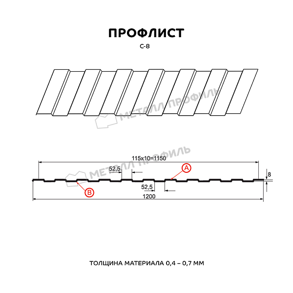 Профиль С-8:Профнастил с самой низкой волной. Его назначение – в большей степени дизайнерская задача, чем несущая. С-8 прекрасно решает такие задачи, как: системы подвесных потолков, монтаж вентилируемых фасадов, внутренняя облицовка индустриальных помещений, возведение ограждений, не подверженных большим климатическим нагрузкам. Одинаковая с обеих сторон конфигурация проката делает С-8 универсальным сырьём для различных архитектурных замыслов. Достаточная толщина стали – от 0,4 до 0,7 мм позволяет профнастилу прекрасно справляться с любым своим назначением. А большая полезная ширина (1150 мм) помогает сэкономить на закупке профлистов. По вашему заказу мы можем изготовить листы металлопроката длиной от 0,5 до 12 метров.