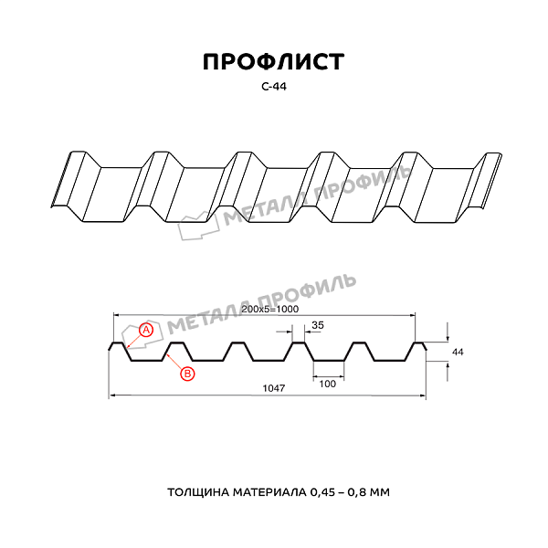 Профнастил С-44 используется фактически в любых сферах строительной отрасли. Он в равной степени популярен как в частном домостроении, так и на промышленных стройках. Профлист с глубиной волны 44 мм отличается довольно хорошими несущими показателями. Это самый объёмный из профилей с обозначением С – «стеновой». С-44 пригодится, если вам нужно: соорудить хозяйственные помещения, поставить ограждения, сделать кровельное покрытие, установить стены и переборки в щитовых постройках. Также данный прокатный лист| профиль характеризуется достаточной несущей способностью для строительства каркасов зданий и несъёмной опалубки для железобетона. Профлист С-44 смело можно использовать в районах с высокими показателями годовых осадков и порывистыми ветрами. Стороны этого профиля асимметричны. Лицевая сторона (А) имеет более ритмичный рисунок из узких полочек и рекомендована для кровли. Сторона В выглядит более монолитно, рекомендована для прочих сфер применения.Покрытие Полиэстер: